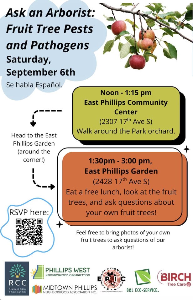 - 1:30pm to 3pm East Phillips Garden – (2428 17th Ave S) Eat a free lunch, look at the fruit trees, and ask questions about your own fruit trees!