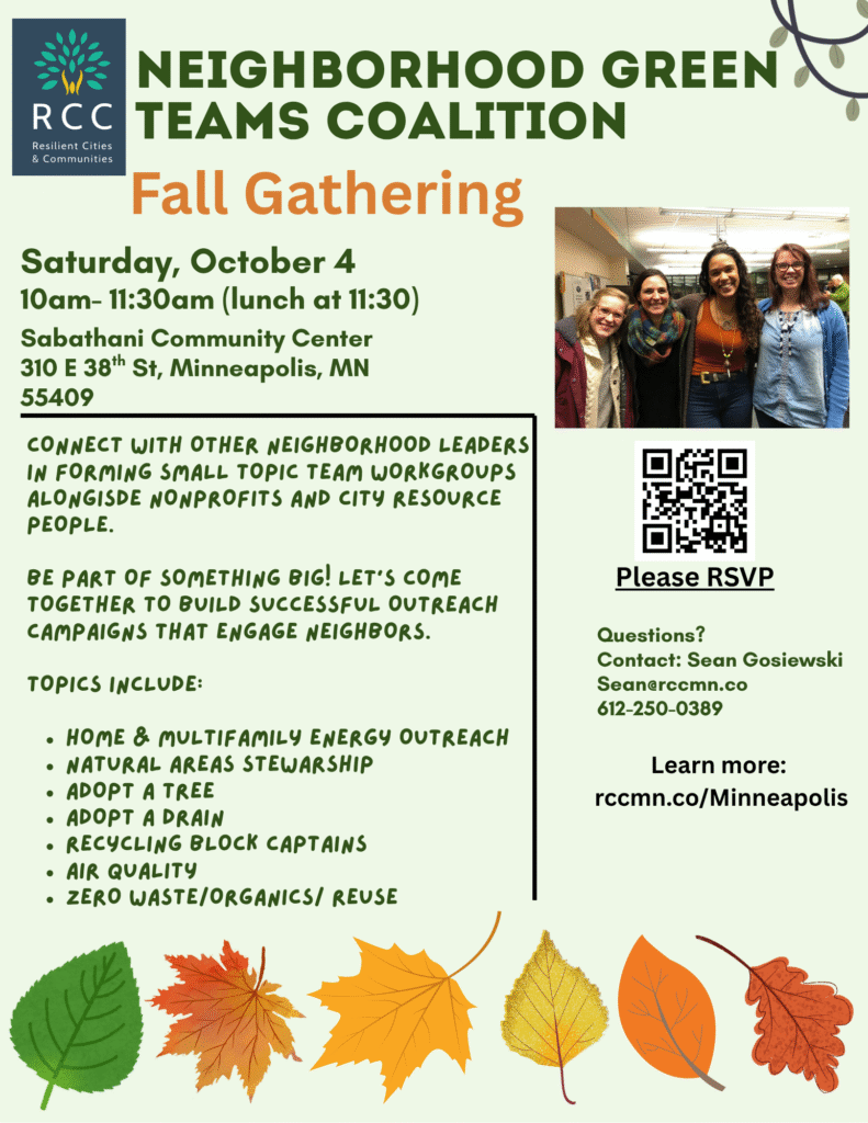 Minneapolis Green Teams Coalition – volunteers & staff active with neighborhood environmental committees & initiatives meeting quarterly to share their initiatives and find resources and partners to effectively engage our neighbors to take green actions to achieve our city’s climate goals together while we build resilient, connected neighborhoods.