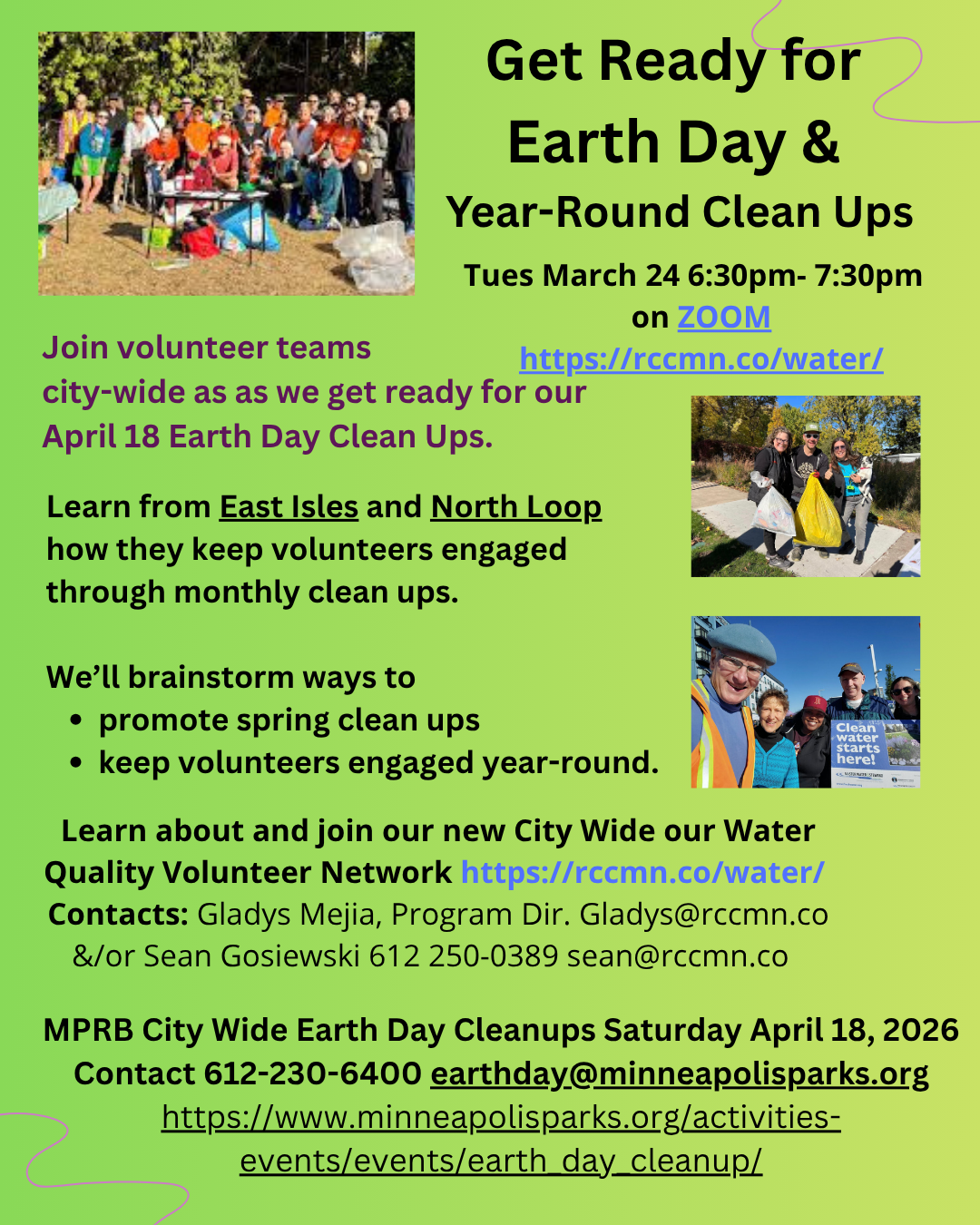 Join neighborhood green team volunteers to get ready for our local earth day park clean ups on April 18 and to learn from East Isles and the North Loop how they keeping volunteers active year round to reduce litter and protect water quality through monthly clean ups. Join our new city wide Water Quality Volunteers Network. Please RSVP Facebook Event to Share